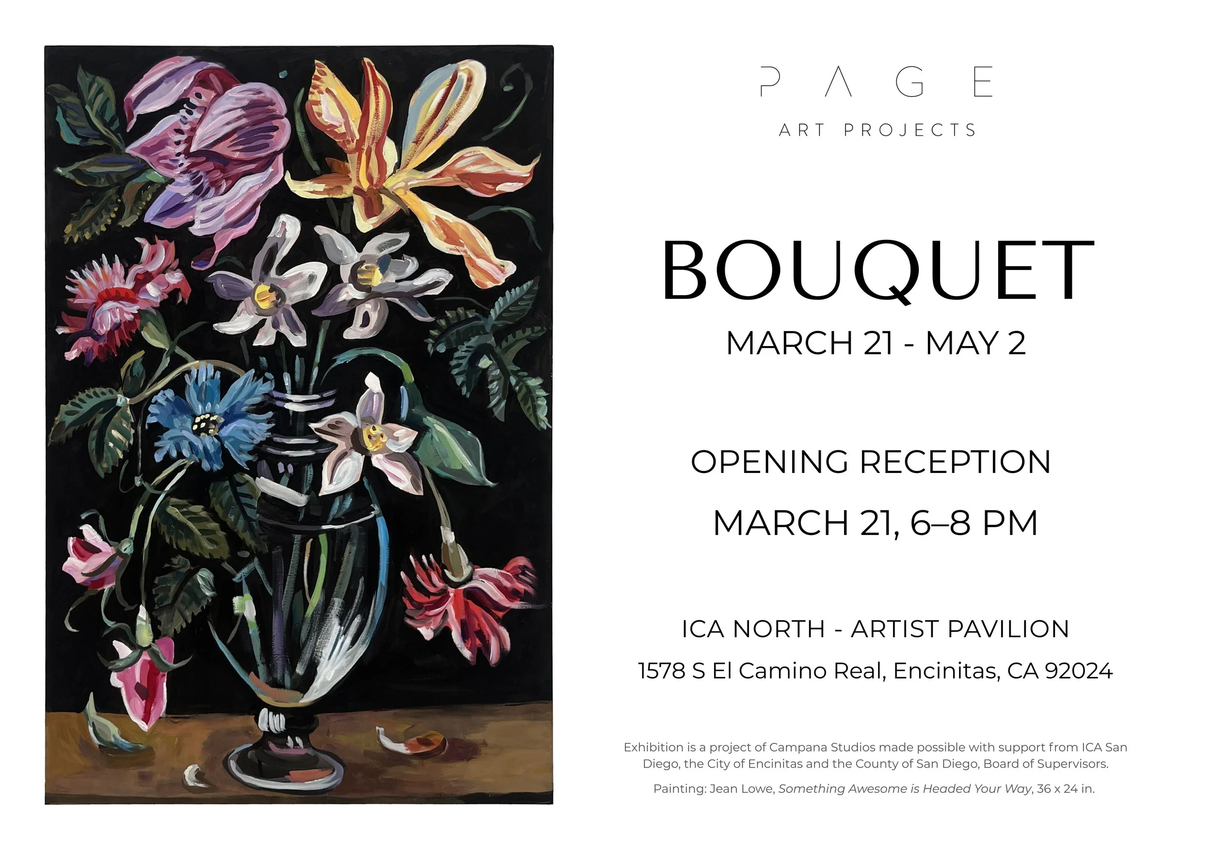 Bouquet is a curated exhibition organized by Page Art Projects and presented as a project of Campana Studios. On view at the ICA North Pavilion in Encinitas, the exhibition brings together five regional artists working across painting and sculpture whose practices engage botanical imagery through observation, history, and imagination.
